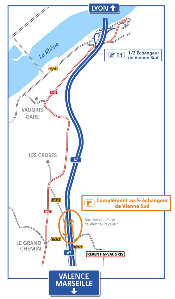 En complétant le demi-échangeur de Vienne Sud existant, le nouvel aménagement positionné sur la commune de Reventin-Vaugris offrira un accès direct à l’autoroute A7 en direction de Lyon et permettra la desserte du territoire du sud de Vienne Condrieu Agglomération et du nord du Pays roussillonnais depuis l’agglomération lyonnaise.
